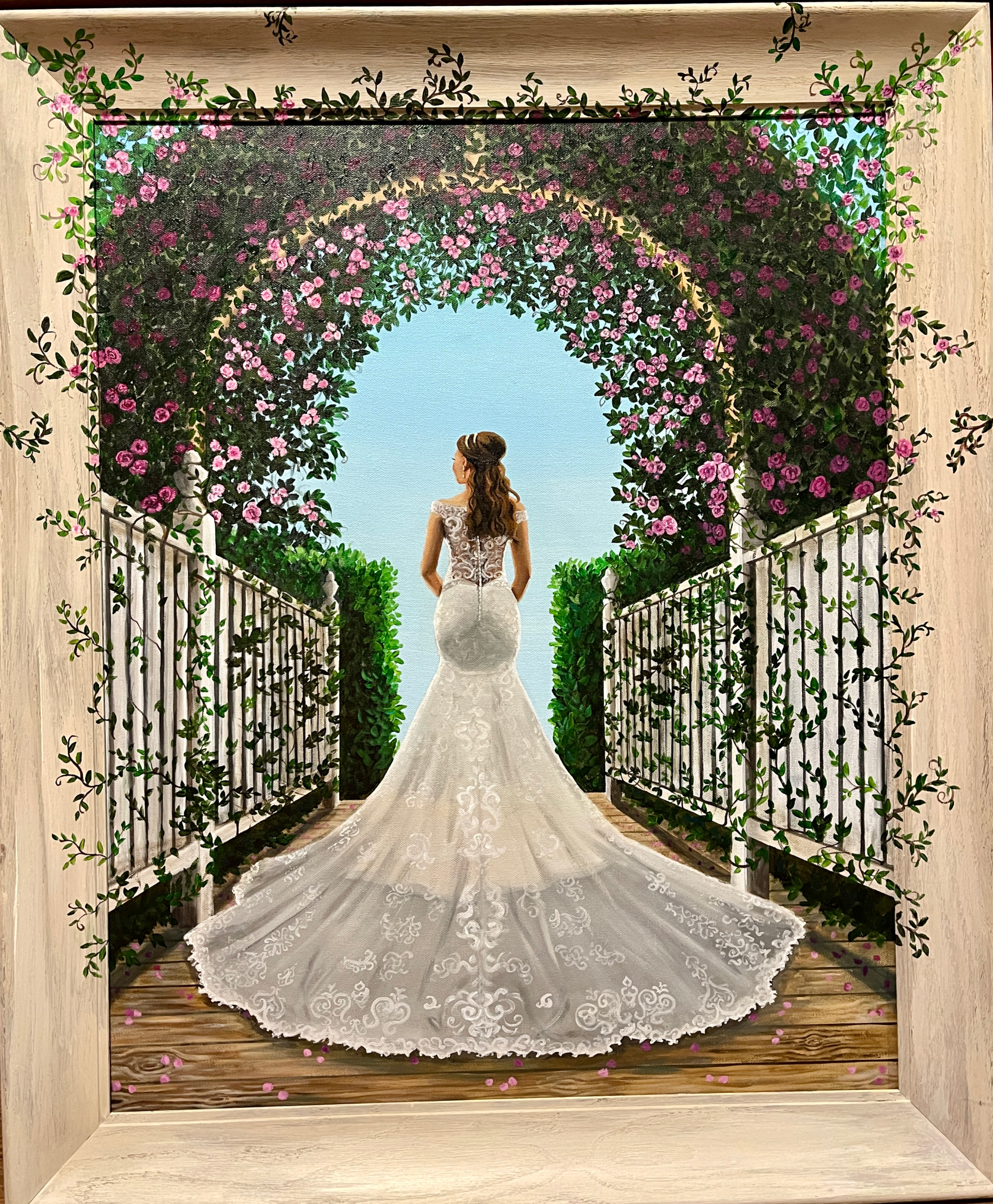 24″ x 30″ bridal portrait from photos in a hand painted wooden frame.