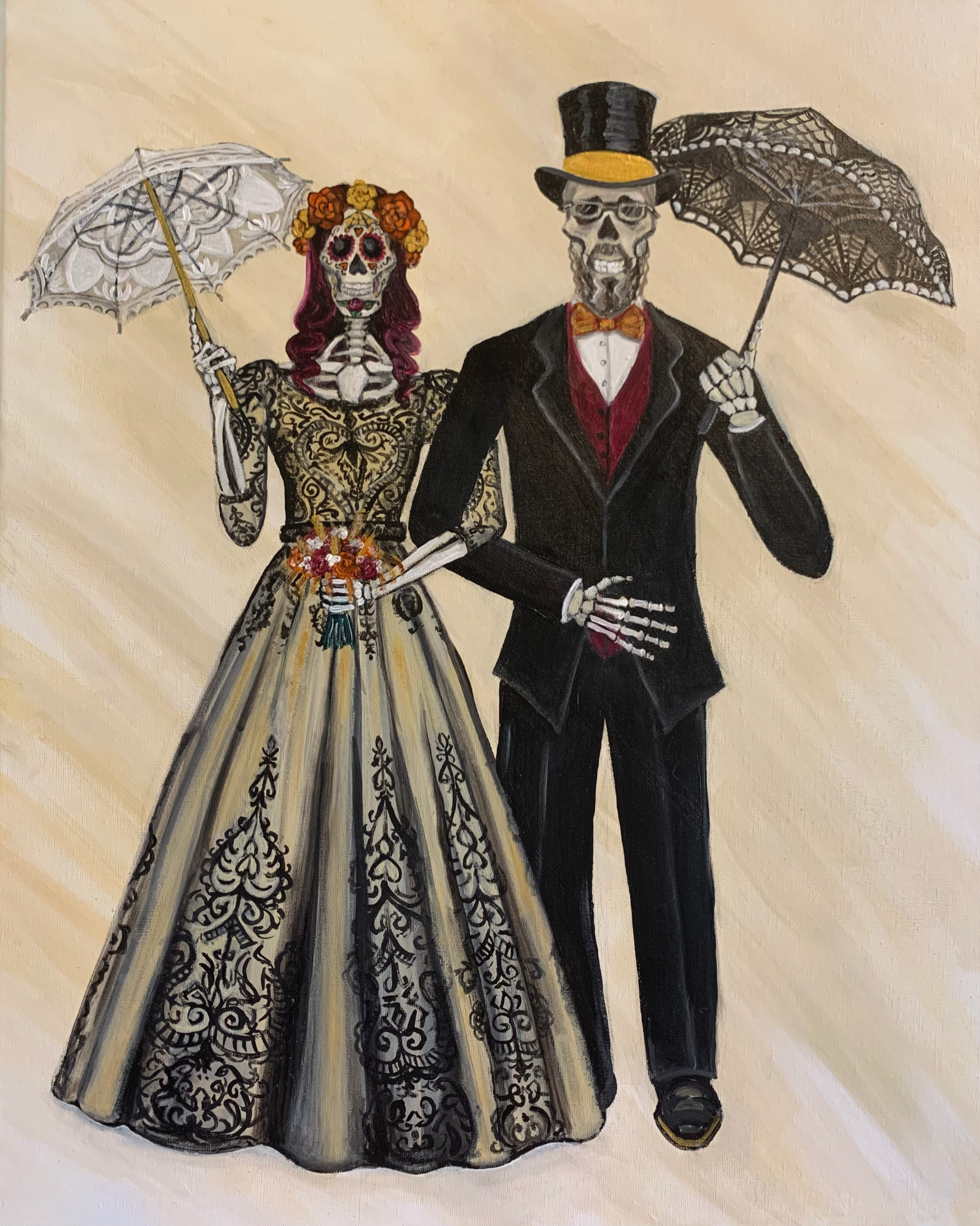 18″ x 24″ portrait of the bride and groom as day of the dead skeletons. Image used on oyster shell favors for a Halloween wedding.