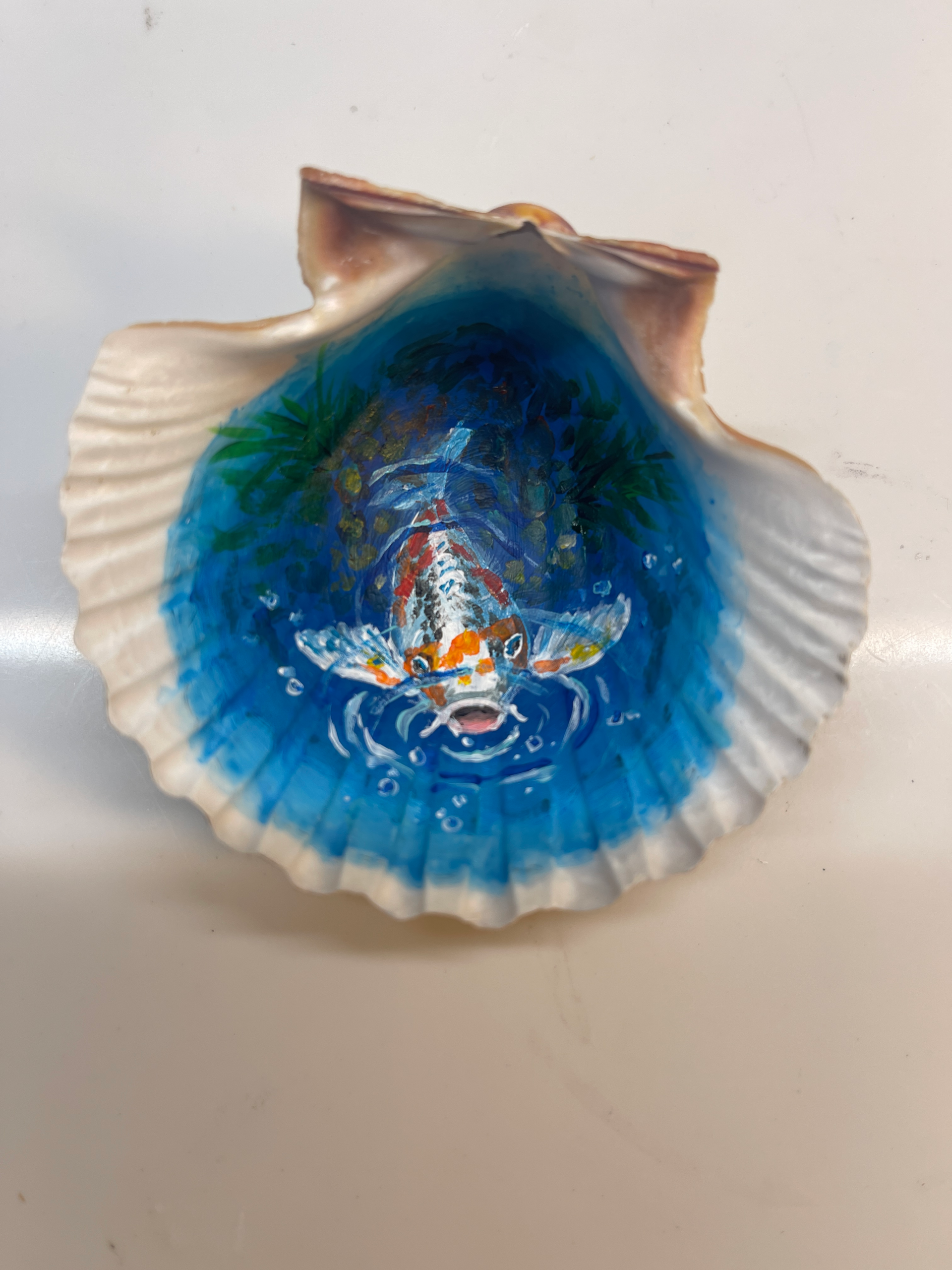 Acrylic painting in sea shell with resin coating.