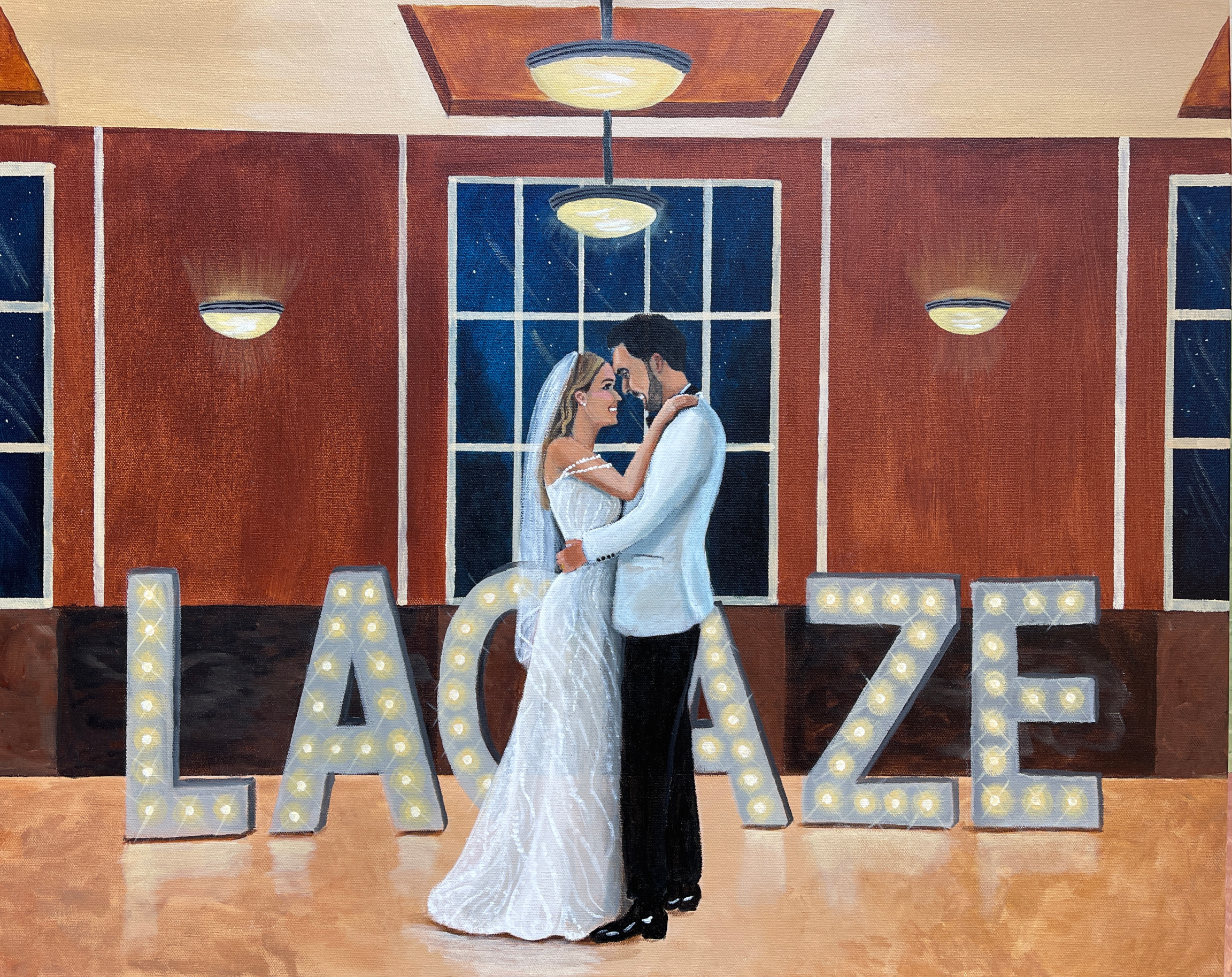 24″ x 30″ semi-impressionistic newlywed package wedding painting at Messina’s at the Terminal.