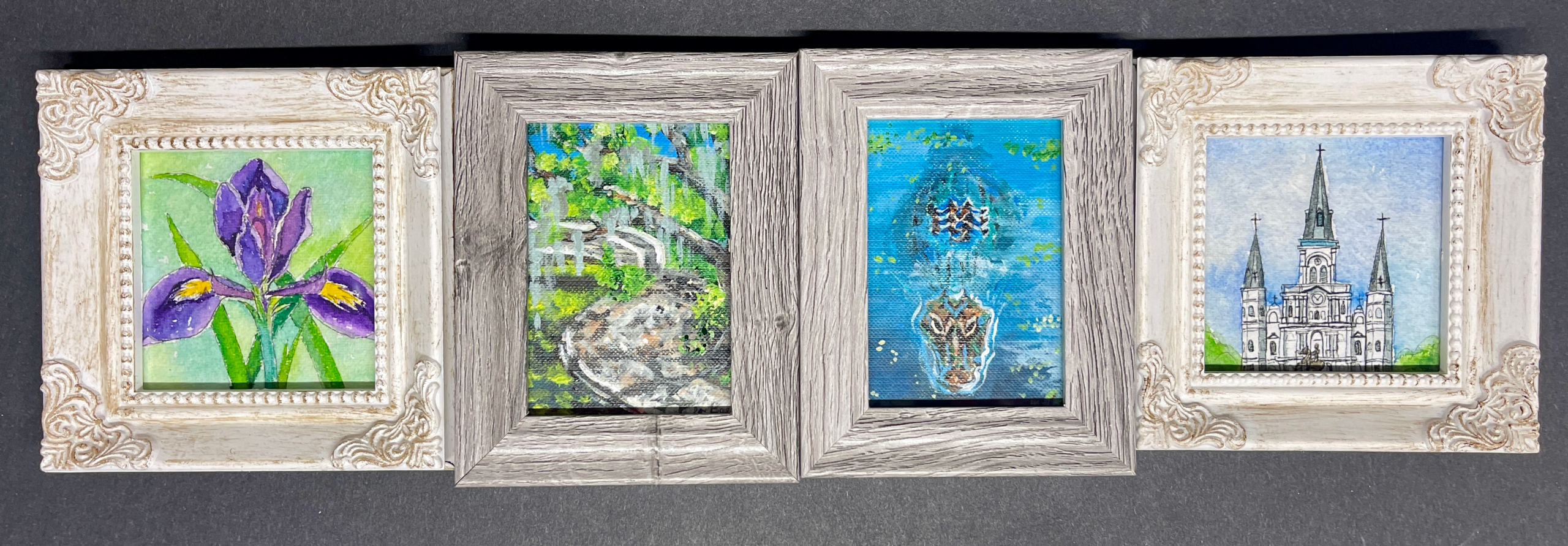 Several 3″ x 2″ miniature acrylics on canvas paper, framed.