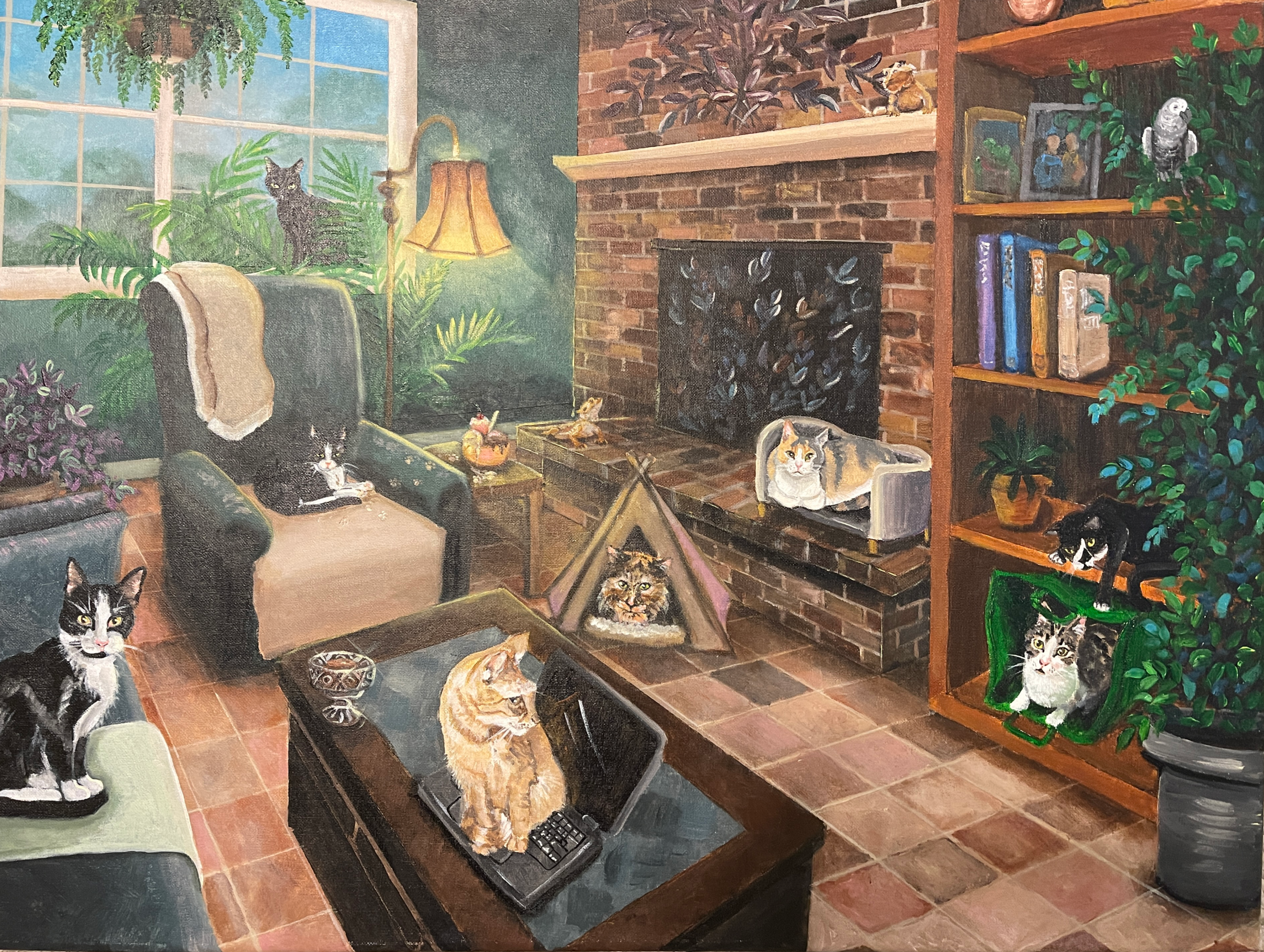 18″ x 24″ acrylic on canvas, portrait of 8 cats, 2 bearded dragons and an African grey parrot.