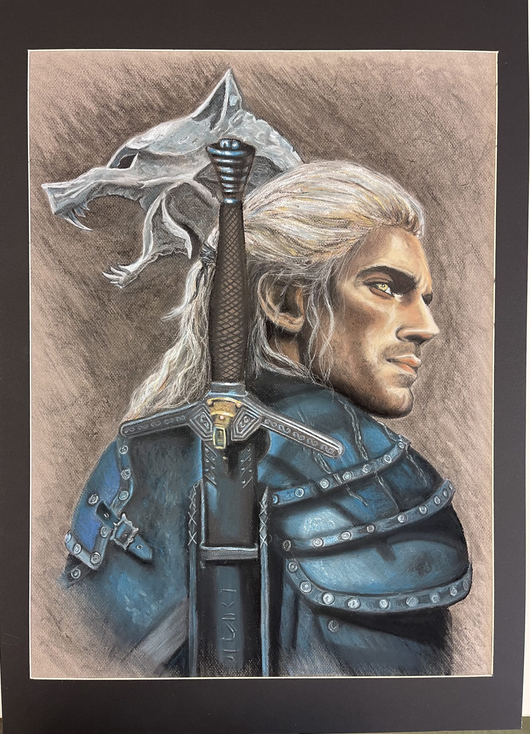 18″ x 24″ chalk pastel on paper. Portrait inspired by the Witcher books, games and TV program.